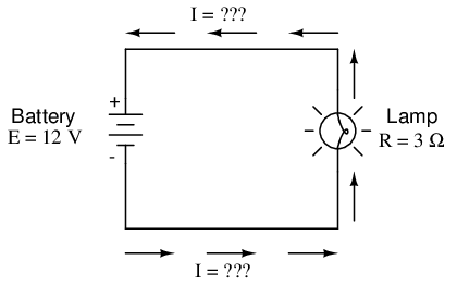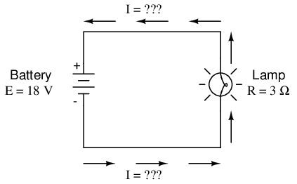 In the above circuit, we know we have a battery voltage of 18 volts and a lamp resistance of 3 Ω. Using Ohm's Law to determine current, we get: