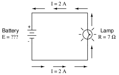 In the above circuit, there is only one source of voltage (the battery, on the left) and only one source of resistance to current (the lamp, on the right). This makes it very easy to apply Ohm's Law. If we know the values of any two of the three quantities (voltage, current, and resistance) in this circuit, we can use Ohm's Law to determine the third.