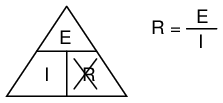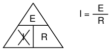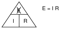 Ohm's Law is a very simple and useful tool for analyzing electric circuits. It is used so often in the study of electricity and electronics that it needs to be committed to memory by the serious student. For those who are not yet comfortable with algebra, there's a trick to remembering how to solve for any one quantity, given the other two. First, arrange the letters E, I, and R in a triangle like this: