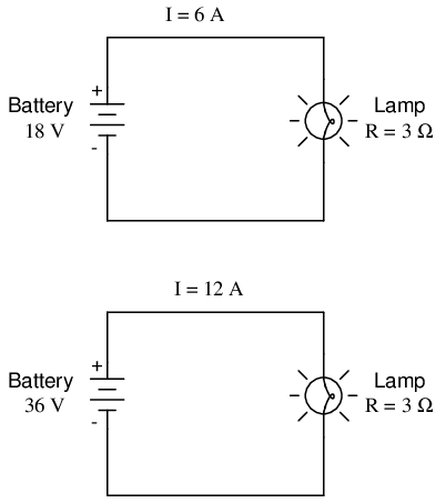Now, the battery voltage is 36 volts instead of 18 volts. The lamp is still providing 3 Ω of electrical resistance to the flow of electrons. The current is now: