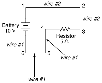Here, we only have 2 components excluding the wires: the battery and the resistor. Though the connecting wires take a convoluted path in forming a complete circuit, there are several electrically common points in the electrons' path. Points 1, 2, and 3 are all common to each other, because they're directly connected together by wire. The same goes for points 4, 5, and 6.