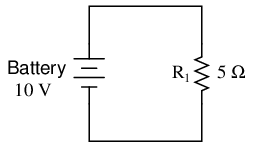 This simple circuit consists of a battery and a resistor connected directly together. We know the voltage of the battery (10 volts) and the resistance of the resistor (5 Ω), but nothing else about the circuit. If we describe this circuit to SPICE, it should be able to tell us (at the very least), how much current we have in the circuit by using Ohm's Law (I=E/R).