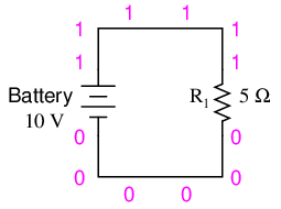 Now, SPICE will know there is a resistor connected between nodes 1 and 0 with a value of 5 Ω. This very brief line of text tells the computer we have a resistor ("r") connected between the same two nodes as the battery (1 and 0), with a resistance value of 5 Ω.