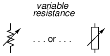 Resistors can also be shown to have varying rather than fixed resistances. This might be for the purpose of describing an actual physical device designed for the purpose of providing an adjustable resistance, or it could be to show some component that just happens to have an unstable resistance: