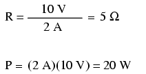 For the circuit conditions of 10 volts and 2 amps, the resistor's resistance must be 5 Ω. If we were designing a circuit to operate at these values, we would have to specify a resistor with a minimum power rating of 20 watts, or else it would overheat and fail.