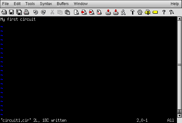 If using a Microsoft operating system such as DOS or Windows, a couple of text editors are readily available with the system. In DOS, there is the old Edit text editing program, which may be invoked by typing edit at the command prompt. In Windows (3.x/95/98/NT/Me/2k/XP), the Notepad text editor is your stock choice. Many other text editing programs are available, and some are even free. I happen to use a free text editor called Vim, and run it under both Windows 95 and Linux operating systems. It matters little which editor you use, so don't worry if the screenshots in this section don't look like yours; the important information here is what you type, not which editor you happen to use.