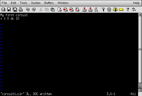 Once we have finished typing all the necessary SPICE commands, we need to "save" them to a file on the computer's hard disk so that SPICE has something to reference to when invoked. Since this is my first SPICE netlist, I'll save it under the filename "circuit1.cir" (the actual name being arbitrary). You may elect to name your first SPICE netlist something completely different, just as long as you don't violate any filename rules for your operating system, such as using no more than 8+3 characters (eight characters in the name, and three characters in the extension: 12345678.123) in DOS.