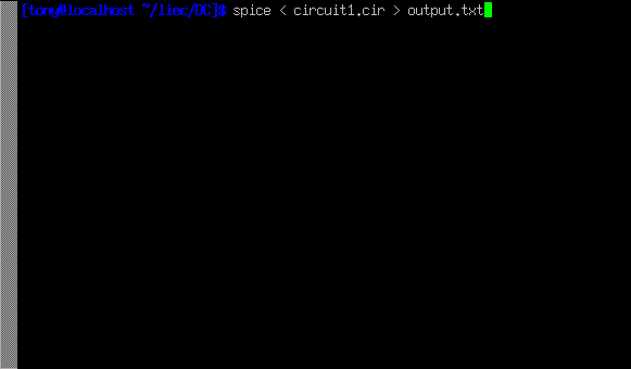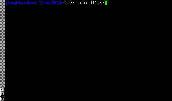 To invoke SPICE (tell it to process the contents of the circuit1.cir netlist file), we have to exit from the text editor and access a command prompt (the "DOS prompt" for Microsoft users) where we can enter text commands for the computer's operating system to obey. This "primitive" way of invoking a program may seem archaic to computer users accustomed to a "point-and-click" graphical environment, but it is a very powerful and flexible way of doing things. Remember, what you're doing here by using SPICE is a simple form of computer programming, and the more comfortable you become in giving the computer text-form commands to follow -- as opposed to simply clicking on icon images using a mouse -- the more mastery you will have over your computer.