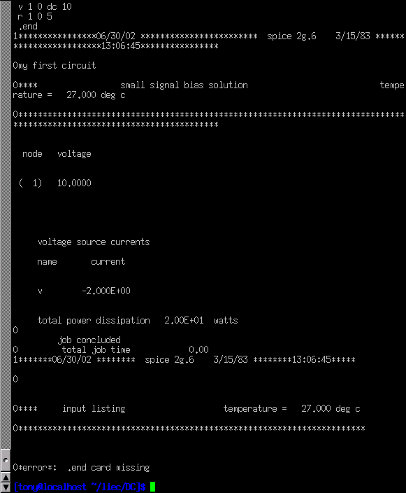 SPICE begins with a reiteration of the netlist, complete with title line and .end statement. About halfway through the simulation it displays the voltage at all nodes with reference to node 0. In this example, we only have one node other than node 0, so it displays the voltage there: 10.0000 volts. Then it displays the current through each voltage source. Since we only have one voltage source in the entire circuit, it only displays the current through that one. In this case, the source current is 2 amps. Due to a quirk in the way SPICE analyzes current, the value of 2 amps is output as a negative (-) 2 amps.