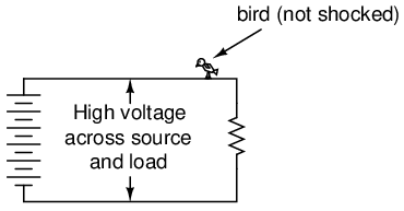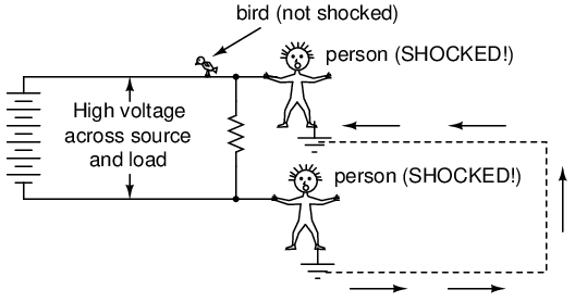 Another benefit of including a detailed lesson on electrical safety is the practical context it sets for basic concepts of voltage, current, resistance, and circuit design. The more relevant a technical topic can be made, the more likely a student will be to pay attention and comprehend. And what could be more relevant than application to your own personal safety? Also, with electrical power being such an everyday presence in modern life, almost anyone can relate to the illustrations given in such a lesson. Have you ever wondered why birds don't get shocked while resting on power lines? Read on and find out!