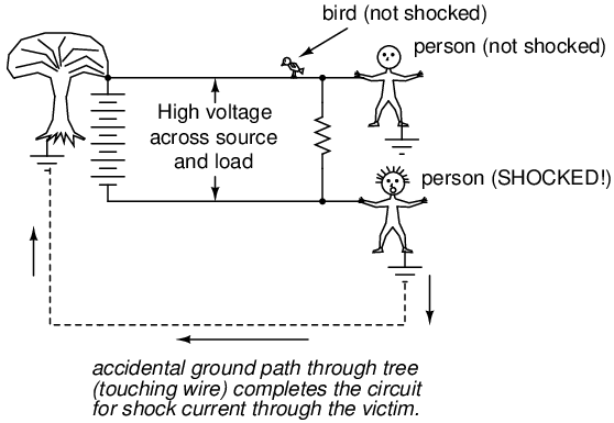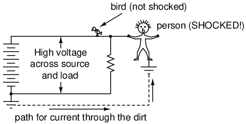 In answer to the third question, dirt is not a very good conductor (at least not when its dry!). It is too poor of a conductor to support continuous current for powering a load. However, as we will see in the next section, it takes very little current to injure or kill a human being, so even the poor conductivity of dirt is enough to provide a path for deadly current when there is sufficient voltage available, as there usually is in power systems.