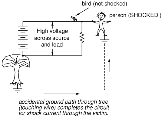 This might lend one to believe that its impossible to be shocked by electricity by only touching a single wire. Like the birds, if we're sure to touch only one wire at a time, we'll be safe, right? Unfortunately, this is not correct. Unlike birds, people are usually standing on the ground when they contact a "live" wire. Many times, one side of a power system will be intentionally connected to earth ground, and so the person touching a single wire is actually making contact between two points in the circuit (the wire and earth ground):