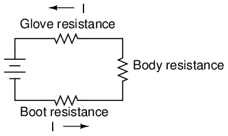Now we'll see an equivalent circuit for a person wearing insulated gloves and boots: