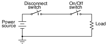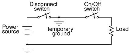 With the disconnect switch in the "open" position as shown (no continuity), the circuit is broken and no current will exist. There will be zero voltage across the load, and the full voltage of the source will be dropped across the open contacts of the disconnect switch. Note how there is no need for a disconnect switch in the lower conductor of the circuit. Because that side of the circuit is firmly connected to the earth (ground), it is electrically common with the earth and is best left that way. For maximum safety of personnel working on the load of this circuit, a temporary ground connection could be established on the top side of the load, to ensure that no voltage could ever be dropped across the load: