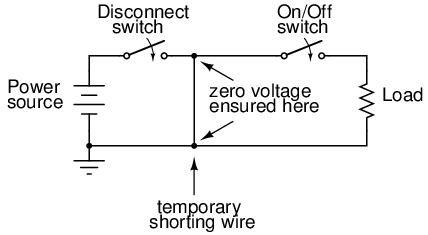 A further benefit of this precaution is protection against the possibility of the disconnect switch being closed (turned "on" so that circuit continuity is established) while people are still contacting the load. The temporary wire connected across the load would create a short-circuit when the disconnect switch was closed, immediately tripping any overcurrent protection devices (circuit breakers or fuses) in the circuit, which would shut the power off again. Damage may very well be sustained by the disconnect switch if this were to happen, but the workers at the load are kept safe.