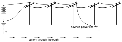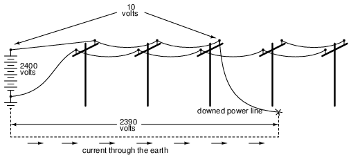 Again, these voltage figures are very approximate, but they serve to illustrate a potential hazard: that a person can become a victim of electric shock from a downed power line without even coming into contact with that line!