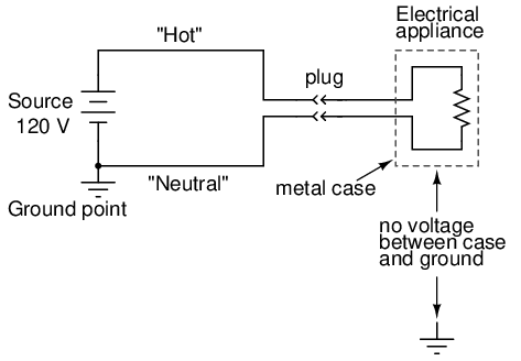 As we saw earlier, a power system with no secure connection to earth ground is unpredictable from a safety perspective: there's no way to guarantee how much or how little voltage will exist between any point in the circuit and earth ground. By grounding one side of the power system's voltage source, at least one point in the circuit can be assured to be electrically common with the earth and therefore present no shock hazard. In a simple two-wire electrical power system, the conductor connected to ground is called the neutral, and the other conductor is called the hot, also known as the live or the active: