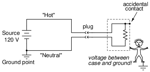 In answer to the first question, the presence of an intentional "grounding" point in an electric circuit is intended to ensure that one side of it is safe to come in contact with. Note that if our victim in the above diagram were to touch the bottom side of the resistor, nothing would happen even though their feet would still be contacting ground: