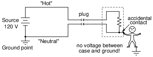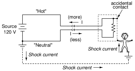 If, however, the hot wire accidently contacts the metal case, there will be current through the person touching the case. The presence of a shock current will be manifested as a difference of current between the two power conductors at the receptacle: