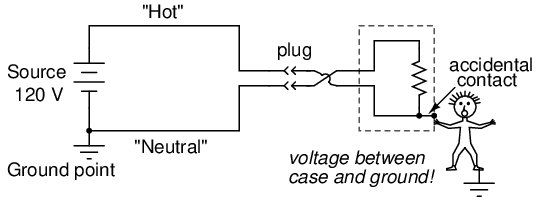 That last detail leads us into another hazard of electric shock, this one peculiar to public power systems. Though our initial study of electric circuits will focus almost exclusively on DC (Direct Current, or electricity that moves in a continuous direction in a circuit), modern power systems utilize alternating current, or AC. The technical reasons for this preference of AC over DC in power systems are irrelevant to this discussion, but the special hazards of each kind of electrical power are very important to the topic of safety.