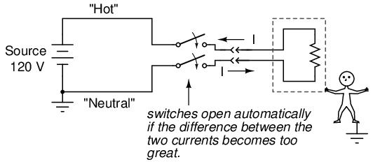 This difference in current between the "hot" and "neutral" conductors will only exist if there is current through the ground connection, meaning that there is a fault in the system. Therefore, such a current difference can be used as a way to detect a fault condition. If a device is set up to measure this difference of current between the two power conductors, a detection of current imbalance can be used to trigger the opening of a disconnect switch, thus cutting power off and preventing serious shock: