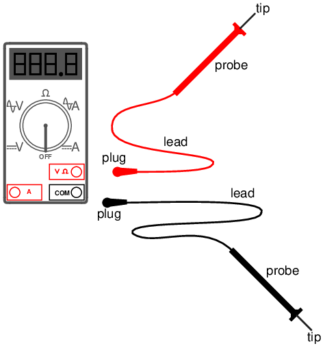 There are three different sockets on the multimeter face into which we can plug our test leads. Test leads are nothing more than specially-prepared wires used to connect the meter to the circuit under test. The wires are coated in a color-coded (either black or red) flexible insulation to prevent the user's hands from contacting the bare conductors, and the tips of the probes are sharp, stiff pieces of wire: