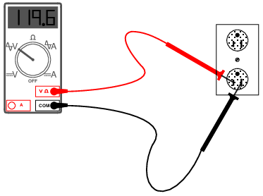 Note that the two test leads are plugged into the appropriate sockets on the meter for voltage, and the selector switch has been set for DC "V". Now, we'll take a look at an example of using the multimeter to measure AC voltage from a household electrical power receptacle (wall socket):