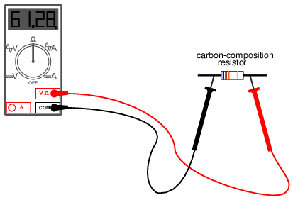 One very important thing to remember about measuring resistance is that it must only be done on de-energized components! When the meter is in "resistance" mode, it uses a small internal battery to generate a tiny current through the component to be measured. By sensing how difficult it is to move this current through the component, the resistance of that component can be determined and displayed. If there is any additional source of voltage in the meter-lead-component-lead-meter loop to either aid or oppose the resistance-measuring current produced by the meter, faulty readings will result. In a worse-case situation, the meter may even be damaged by the external voltage.