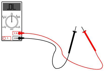 If the leads are not in contact with each other, or touching opposite ends of a broken wire, the meter will indicate infinite resistance (usually by displaying dashed lines or the abbreviation "O.L." which stands for "open loop"):