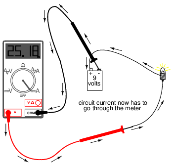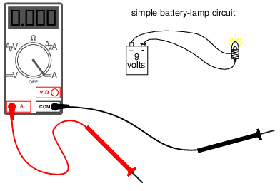 This example shows a very safe circuit to work with. 9 volts hardly constitutes a shock hazard, and so there is little to fear in breaking this circuit open (bare handed, no less!) and connecting the meter in-line with the flow of electrons. However, with higher power circuits, this could be a hazardous endeavor indeed. Even if the circuit voltage was low, the normal current could be high enough that an injurious spark would result the moment the last meter probe connection was established.
