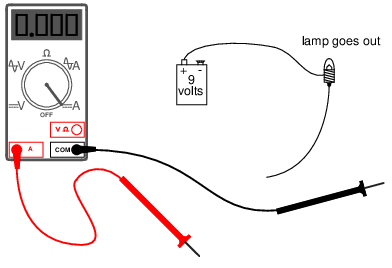 The next step is to insert the meter in-line with the circuit by connecting the two probe tips to the broken ends of the circuit, the black probe to the negative (-) terminal of the 9-volt battery and the red probe to the loose wire end leading to the lamp: