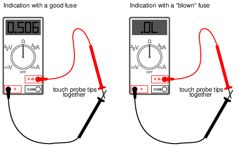 All good-quality multimeters contain fuses inside that are engineered to "blow" in the event of excessive current through them, such as in the case illustrated in the last image. Like all overcurrent protection devices, these fuses are primarily designed to protect the equipment (in this case, the meter itself) from excessive damage, and only secondarily to protect the user from harm. A multimeter can be used to check its own current fuse by setting the selector switch to the resistance position and creating a connection between the two red sockets like this: