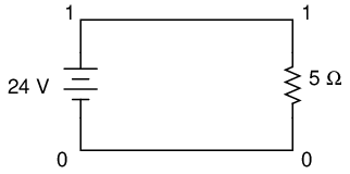 The line "v1 1 0 dc 24" describes the battery, positioned between nodes 1 and 0, with a DC voltage of 24 volts. The line "r1 1 0 5" describes the 5 Ω resistor placed between nodes 1 and 0.
