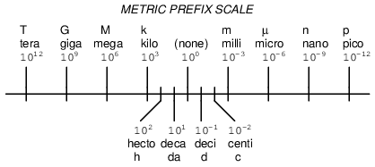 POWER METRIC PREFIX ----- ------------- 12 ......... Tera (T) 9 .......... Giga (G) 6 .......... Mega (M) 3 .......... Kilo (k) 0 .......... UNITS (plain) -3 ......... milli (m) -6 ......... micro (u) -9 ......... nano (n) -12 ........ pico (p)