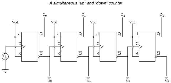 A synchronous counter, in contrast to an asynchronous counter, is one whose output bits change state simultaneously, with no ripple. The only way we can build such a counter circuit from J-K flip-flops is to connect all the clock inputs together, so that each and every flip-flop receives the exact same clock pulse at the exact same time: