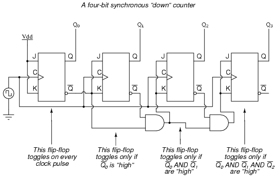The result is a four-bit synchronous "up" counter. Each of the higher-order flip-flops are made ready to toggle (both J and K inputs "high") if the Q outputs of all previous flip-flops are "high." Otherwise, the J and K inputs for that flip-flop will both be "low," placing it into the "latch" mode where it will maintain its present output state at the next clock pulse. Since the first (LSB) flip-flop needs to toggle at every clock pulse, its J and K inputs are connected to Vcc or Vdd, where they will be "high" all the time. The next flip-flop need only "recognize" that the first flip-flop's Q output is high to be made ready to toggle, so no AND gate is needed. However, the remaining flip-flops should be made ready to toggle only when all lower-order output bits are "high," thus the need for AND gates.