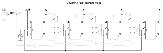 Taking this idea one step further, we can build a counter circuit with selectable between "up" and "down" count modes by having dual lines of AND gates detecting the appropriate bit conditions for an "up" and a "down" counting sequence, respectively, then use OR gates to combine the AND gate outputs to the J and K inputs of each succeeding flip-flop: