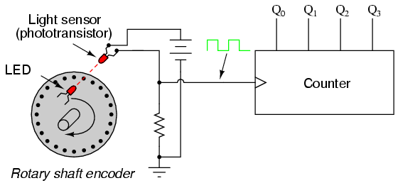 As the machine moves, it turns the encoder shaft, making and breaking the light beam between LED and phototransistor, thereby generating clock pulses to increment the counter circuit. Thus, the counter integrates, or accumulates, total motion of the shaft, serving as an electronic indication of how far the machine has moved. If all we care about is tracking total motion, and do not care to account for changes in the direction of motion, this arrangement will suffice. However, if we wish the counter to increment with one direction of motion and decrement with the reverse direction of motion, we must use an up/down counter, and an encoder/decoding circuit having the ability to discriminate between different directions.