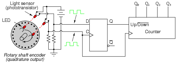 If we re-design the encoder to have two sets of LED/phototransistor pairs, those pairs aligned such that their square-wave output signals are 90o out of phase with each other, we have what is known as a quadrature output encoder (the word "quadrature" simply refers to a 90o angular separation). A phase detection circuit may be made from a D-type flip-flop, to distinguish a clockwise pulse sequence from a counter-clockwise pulse sequence: