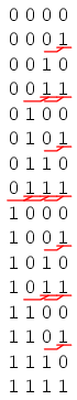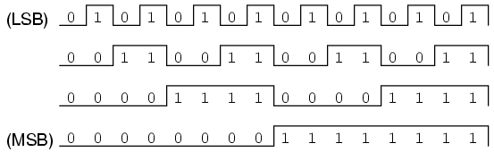 If we examine a four-bit binary count sequence from 0000 to 1111, a definite pattern will be evident in the "oscillations" of the bits between 0 and 1: