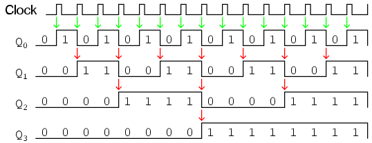 Note that each bit in this four-bit sequence toggles when the bit before it (the bit having a lesser significance, or place-weight), toggles in a particular direction: from 1 to 0. Small arrows indicate those points in the sequence where a bit toggles, the head of the arrow pointing to the previous bit transitioning from a "high" (1) state to a "low" (0) state: