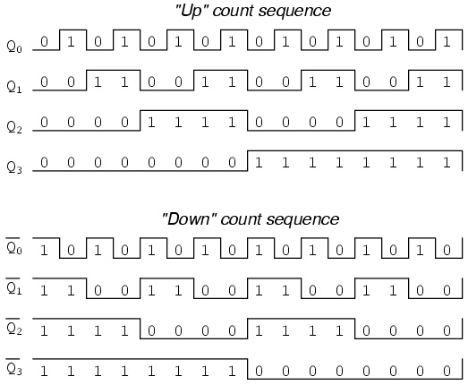 One way we could expand the capabilities of either of these two counter circuits is to regard the Q' outputs as another set of four binary bits. If we examine the pulse diagram for such a circuit, we see that the Q' outputs generate a down-counting sequence, while the Q outputs generate an up-counting sequence: