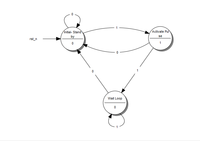 For example, when we are in the "Initial-Stand by" state and we "read" a 1, the diagram tells us that we have to go to the "Activate Pulse" state. If we read a 0 we must stay on the "Initial-Stand by" state.