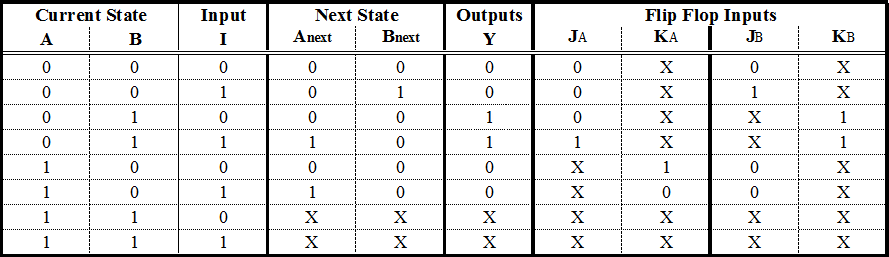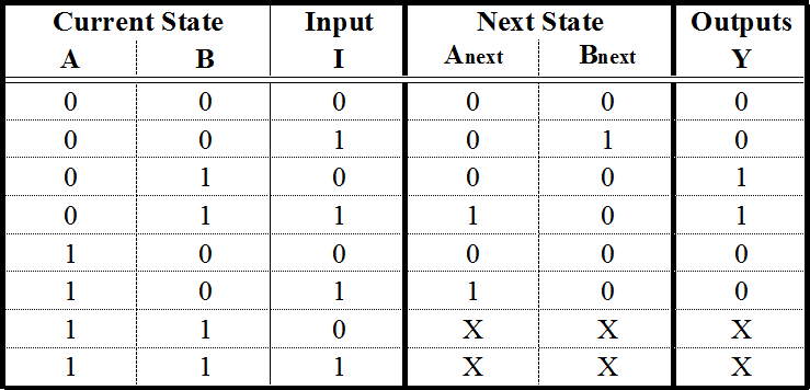 Each row of the Next State columns is filled as follows: We fill it in with the state that we reach when, in the State Diagram, from the Current State of the same row we follow the Input of the same row. If have to fill in a row whose Current State number doesn't correspond to any actual State in the State Diagram we fill it with Don't Care terms (X). After all, we don't care where we can go from a State that doesn't exist. We wouldn't be there in the first place! Again it is simpler than it sounds.