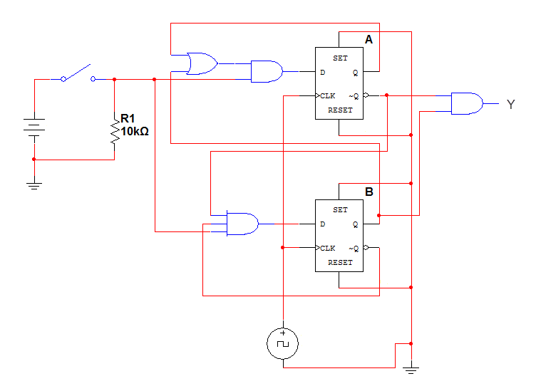 So let's suppose we have a digital quiz game that works on a clock and reads an input from a manual button. However, we want the switch to transmit only one HIGH pulse to the circuit. If we hook the button directly on the game circuit it will transmit HIGH for as few clock cycles as our finger can achieve. On a common clock frequency our finger can never be fast enough.