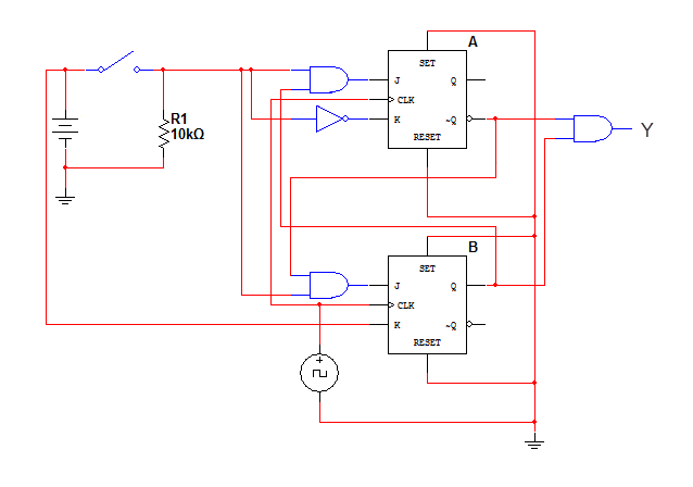 Now, the question is, what do we do with the J and K inputs? We know that we still have to maintain the same divide-by-two frequency pattern in order to count in a binary sequence, and that this pattern is best achieved utilizing the "toggle" mode of the flip-flop, so the fact that the J and K inputs must both be (at times) "high" is clear. However, if we simply connect all the J and K inputs to the positive rail of the power supply as we did in the asynchronous circuit, this would clearly not work because all the flip-flops would toggle at the same time: with each and every clock pulse!