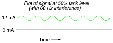 If the wires of this circuit are arranged too close to wires carrying 60 Hz AC power, for example, inductive and capacitive coupling may create a false "noise" signal to be introduced into this otherwise DC circuit. Although the low impedance of a 4-20 mA loop (250 Ω, typically) means that small noise voltages are significantly loaded (and thereby attenuated by the inefficiency of the capacitive/inductive coupling formed by the power wires), such noise can be significant enough to cause measurement problems: