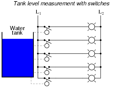 The above example is a bit exaggerated, but the concept should be clear: any electrical noise introduced into an analog measurement system will be interpreted as changes in the measured quantity. One way to combat this problem is to symbolize the tank's water level by means of a digital signal instead of an analog signal. We can do this really crudely by replacing the analog transmitter device with a set of water level switches mounted at different heights on the tank: