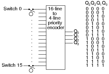 Now that we know digital signals are far more resistant to error induced by "noise," let's improve on this tank level measurement system. For instance, we could increase the resolution of this tank gauging system by adding more switches, for more precise determination of water level. Suppose we install 16 switches along the tank's height instead of five. This would significantly improve our measurement resolution, but at the expense of greatly increasing the quantity of wires needing to be strung between the tank and the monitoring location. One way to reduce this wiring expense would be to use a priority encoder to take the 16 switches and generate a binary number which represented the same information: