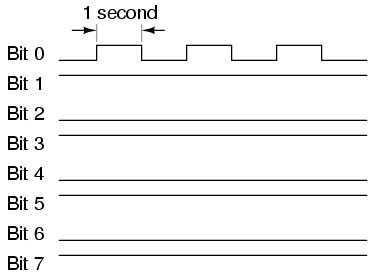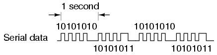 On the other hand, if we used an 8-bit serial network, all data bits must appear on the single channel in sequence. And these bits must be output by the transmitter within the 1-second window of time between A/D converter updates. Therefore, the alternating digital output of 10101010 and 10101011 (once per second) would look something like this: